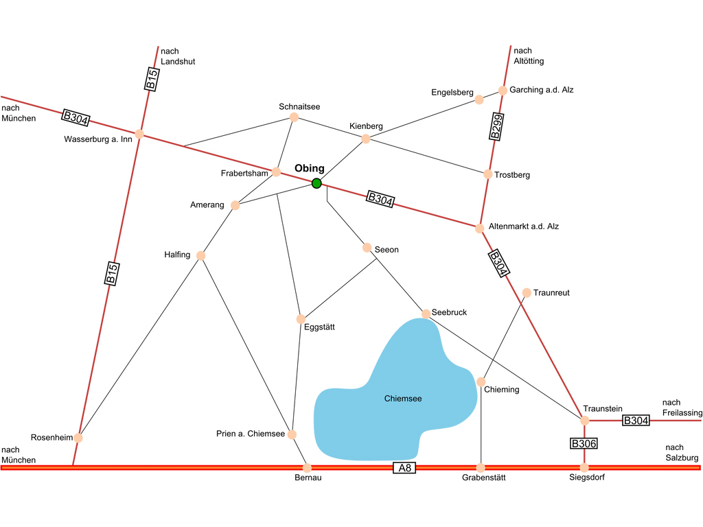 Obing liegt direkt an der B304 (München – Freilassing) zwischen Wasserburg und Altenmarkt.